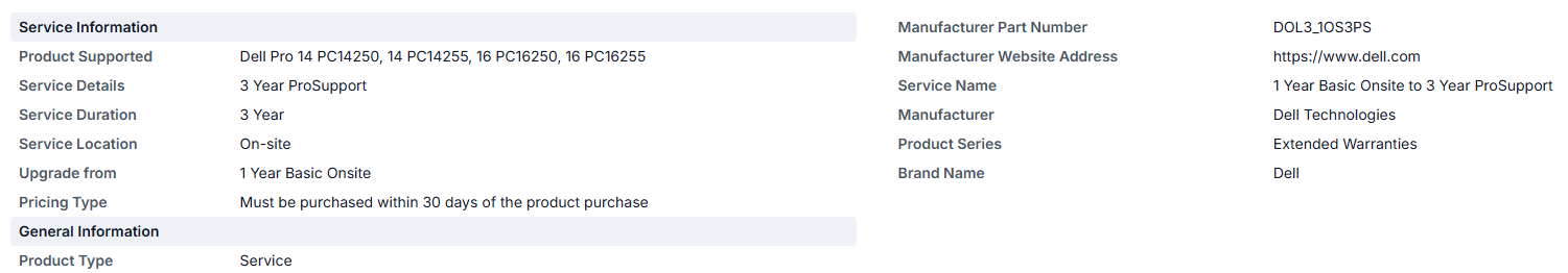 Dell DOL3_1OS3PS, Pro14 PC14250 / PC14255 / PRO16 PC16250 / PC16255 1 Year Onsite To 3 Year Pro Support