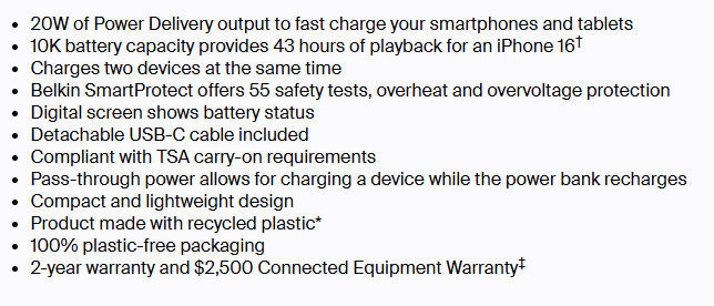 Belkin BPB027FQBK, BoostCharge 10K mAh Power Bank with Display + USB-C to USB-C Cable 60W (15CM), 20W, 2x USB-C Ports