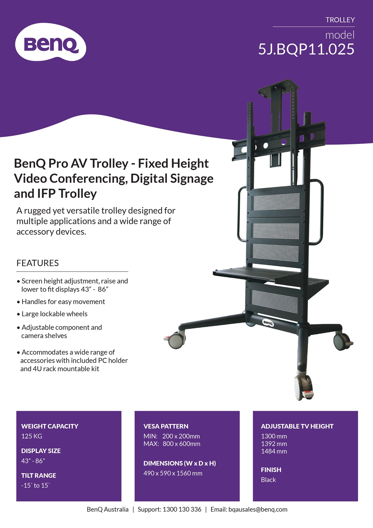 BenQ 5J.BQP11.025, Pro AV Trolley-Fixed Height Video Conferencing, Digital Signage and IFP Trolley,