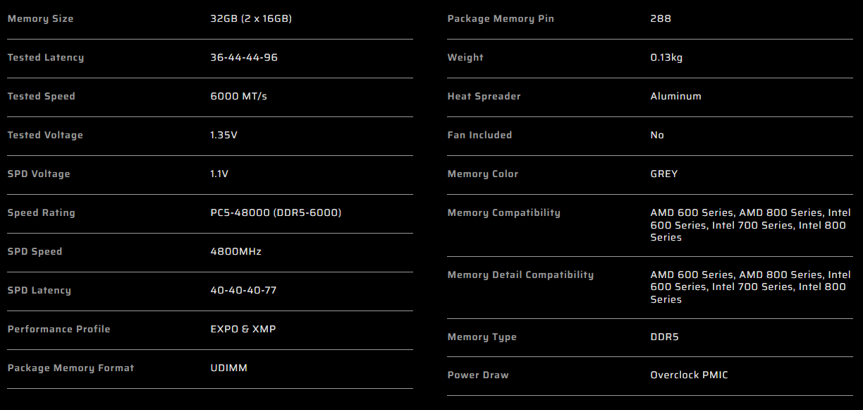 Corsair CMK32GX5M2F6000Z36, Vengeance DDR5 Desktop Memory, 32GB (2x16GB), 4800MHz, CL36, 1.35V