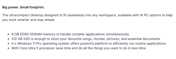 Dell BTP102_QCM1250_AU, Pro Micro QCM1250, Intel Core Ultra 5-235T, 8GB DDR5 RAM, 512GB SSD, Keyboard+Mouse, Wireless AX+Bluetooth, Windows 11 Pro