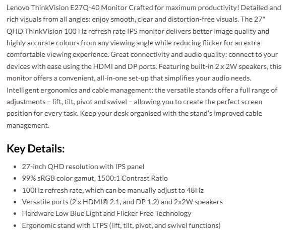Lenovo 64BDGAR4AU, ThinkVision E27Q-40 Widescreen LED Monitor, 27" WQHD IPS Screen, 2560x1440, 16:9, 4ms, 100Hz, 2xHDMI, 1xDP, Speakers, VESA, Height Adjustable, Swivel, Pivot, Tilt