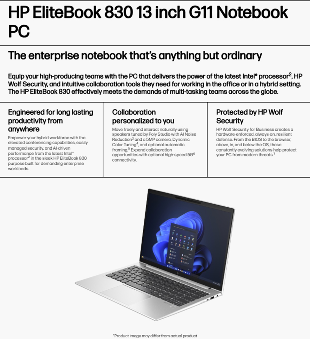 HP A1SY8PA, EliteBook 830 G11, 13.3" WUXGA Screen (IR-Webcam), Intel Ultra 7-155U, 16GB DDR5 RAM, 512GB NVMe SSD, Wireless AX+Bluetooth, Windows 11 Pro