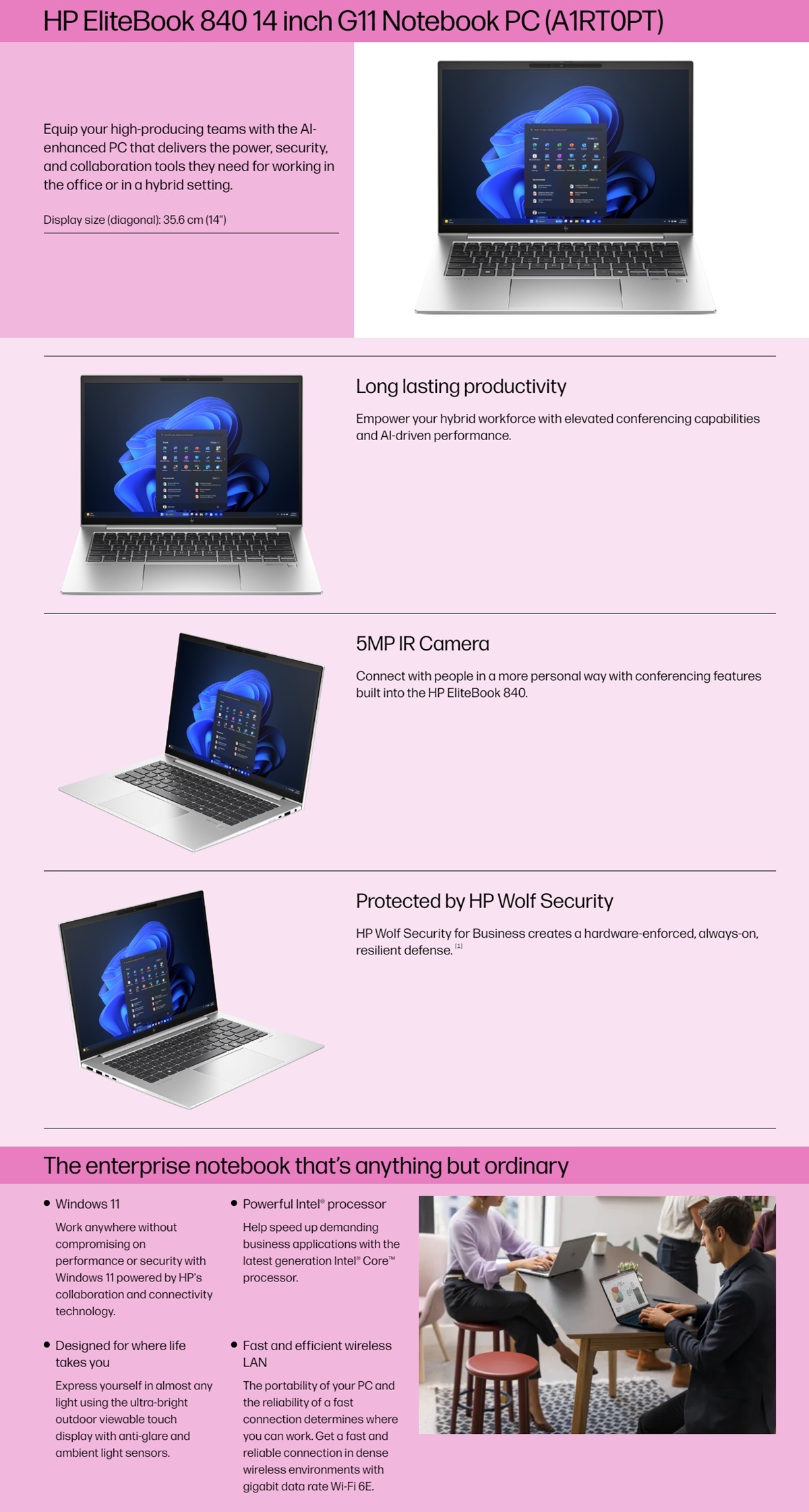 HP A1RP2PT, EliteBook 840 G11, 14" WUXGA Screen (IR-Webcam), Intel Ultra 5-125U, 16GB DDR5 RAM, 512GB NVMe SSD, Wireless AX+Bluetooth, Windows 11 Pro,
