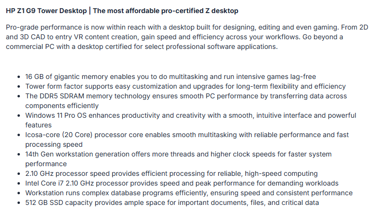 HP C53YFPT, Z1 G9 Tower, Intel Core i7-14700, 16GB DDR5 RAM, 512GB NVMe SSD, Nvidia GeForce 5060 8GB GDDR7, Wireless AX+Bluetooth, Windows 11 Pro