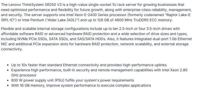 Lenovo 7DCLA00WAU, SR250 V3, Intel Xeon E-2478, 8C(1/1), 16GB(1/4) DDR5 RAM, 2.5" (0/8) Hard Drive, 800watt Power Supply(1/2), 1U