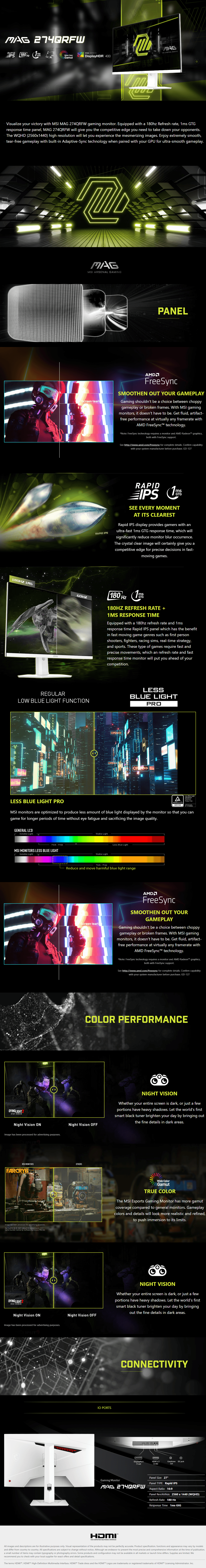 MSI MAG 274QRFW, 27" Rapid IPS, 2560x1440, 16:9, 1ms, 180Hz, Adaptice Sync, 2xHDMI, 1xDP, VESA, Adjustable Height, Tilt, Swivel, Pivot, 3 Year Warranty