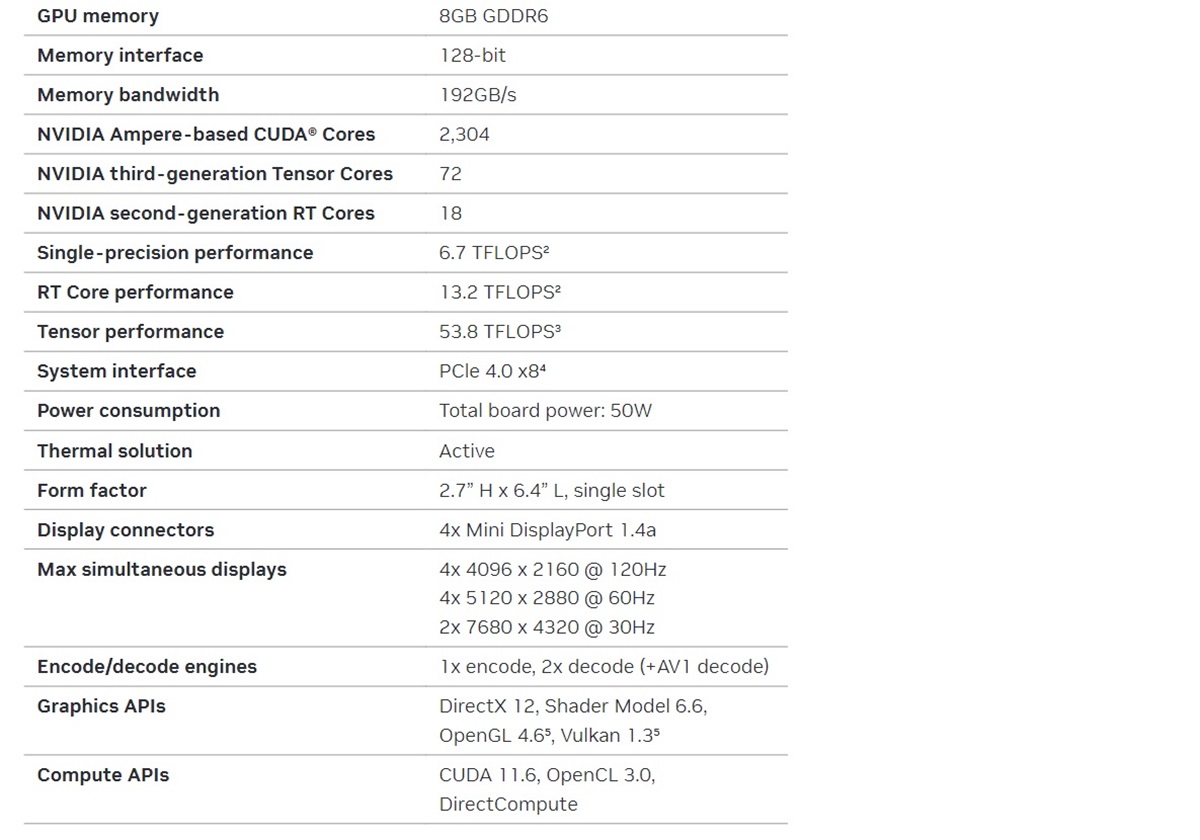 NVIDIA 900-5G172-2580-000, Nvidia RTX A1000, 8GB GDDR6, Cuda Core: 2304, 4x Mini DP, PCIe4.0
