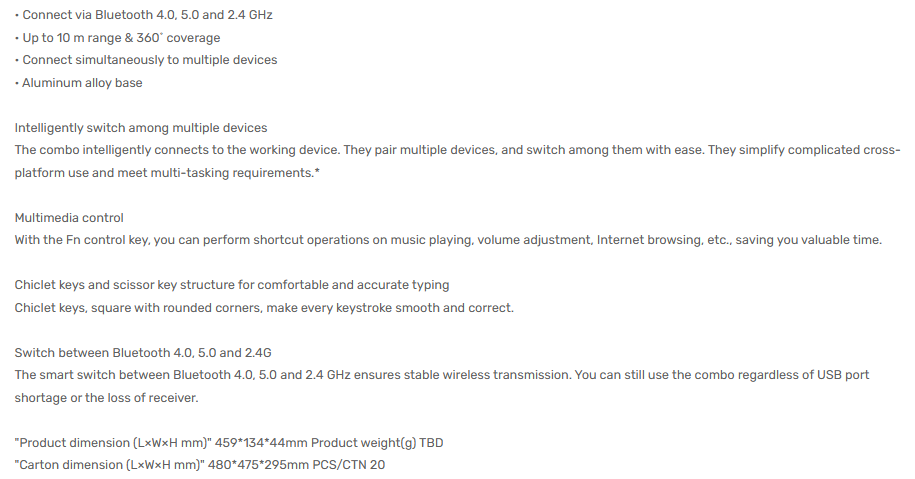 | Device Switching | Keyboard: up to 4 devices; Mouse: up to 2 devices |
