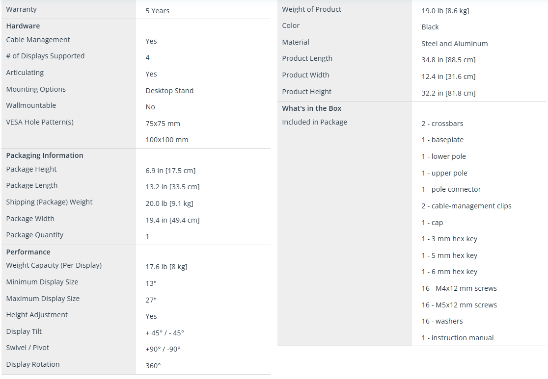 Clear up your desk surface and enjoy an ergonomic workspace. This computer monitor stand supports four displays that are each 13” to 27” (330 to 686 mm) in size and up to 17.6 lb. (8 kg) in weight.