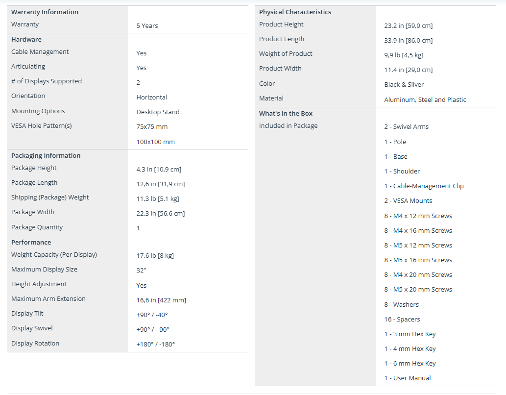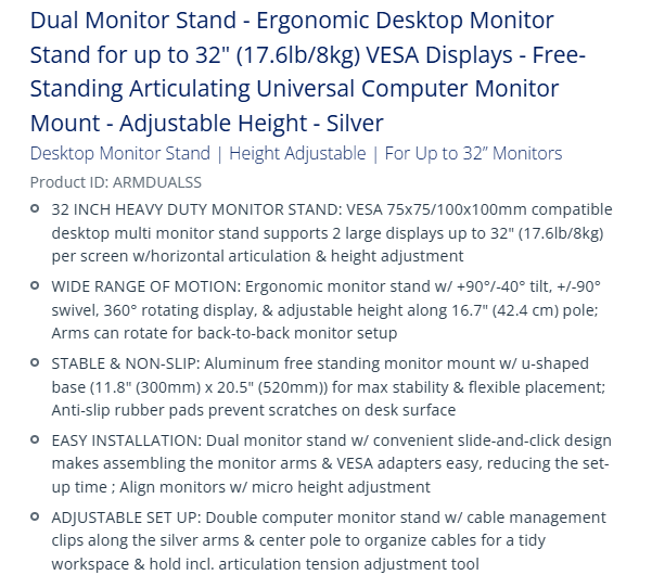 StarTech ARMDUALSS, Dual Monitor Stand for up to 32" VESA Display, 8kg Max Support per Screen