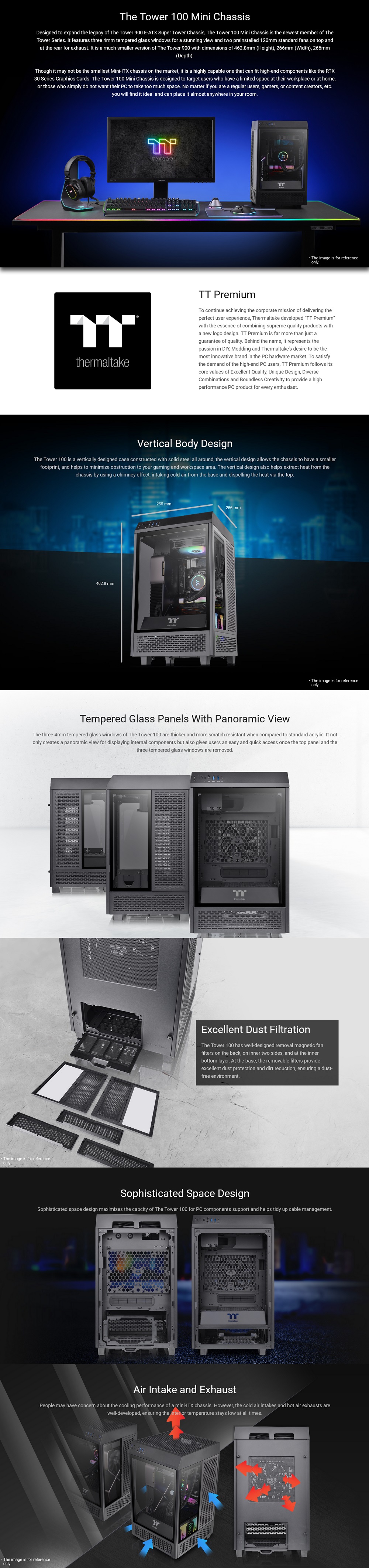 Thermaltake CA-1R3-00S1WN-00, Tower 100, Mini-Tower, Tempered Glass, Drive Bays: 2x2.5", 2x3.5", Expansion Slot: 2, Motherboard Support: Mini-ITX, Pre-Installed Fan: 2x120mm, Black